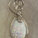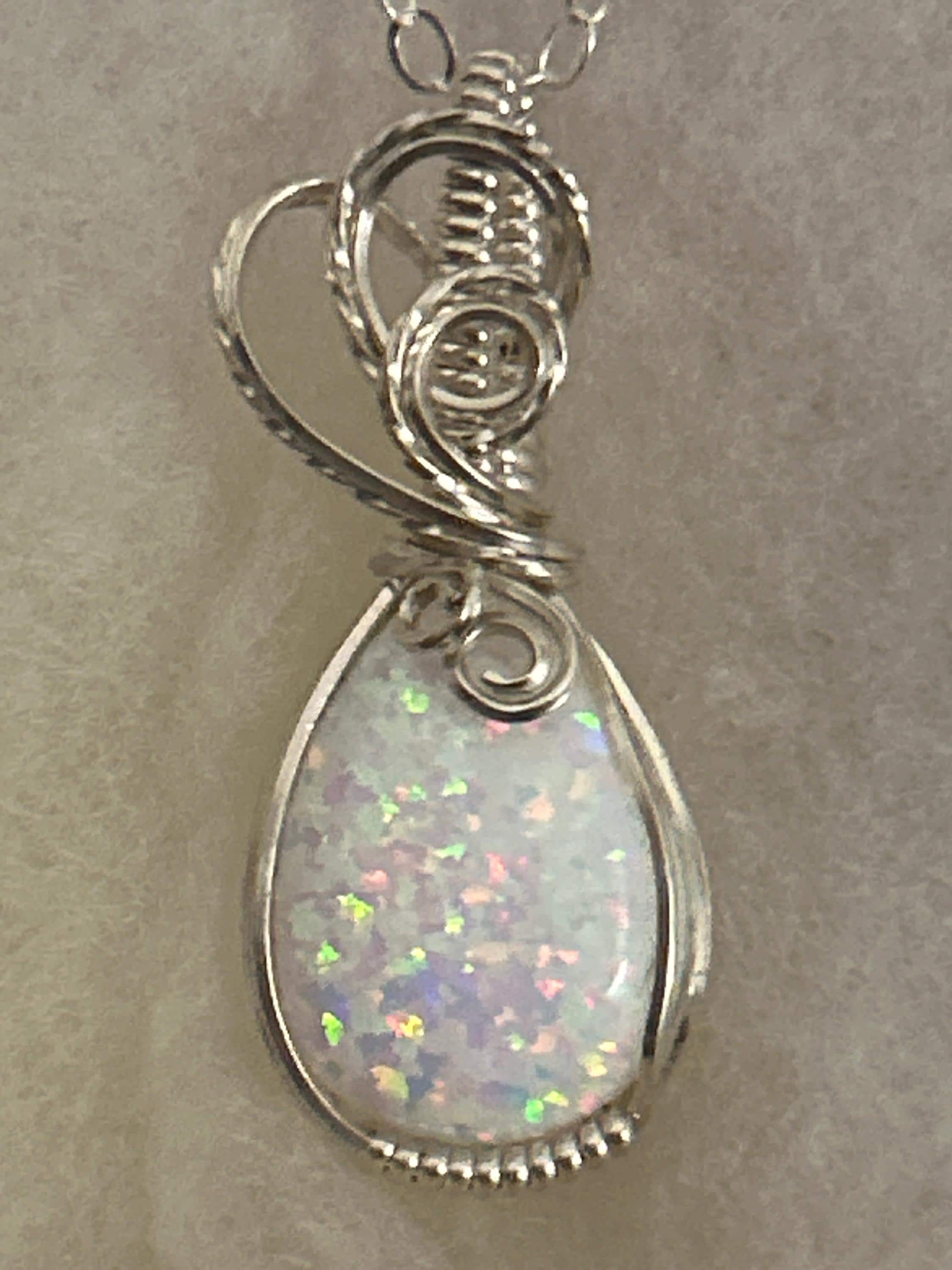 This gorgeous, light,& beautiful dazzling teardrop simulated/synthetic Opal is wire wrapped using .925 sterling silver.